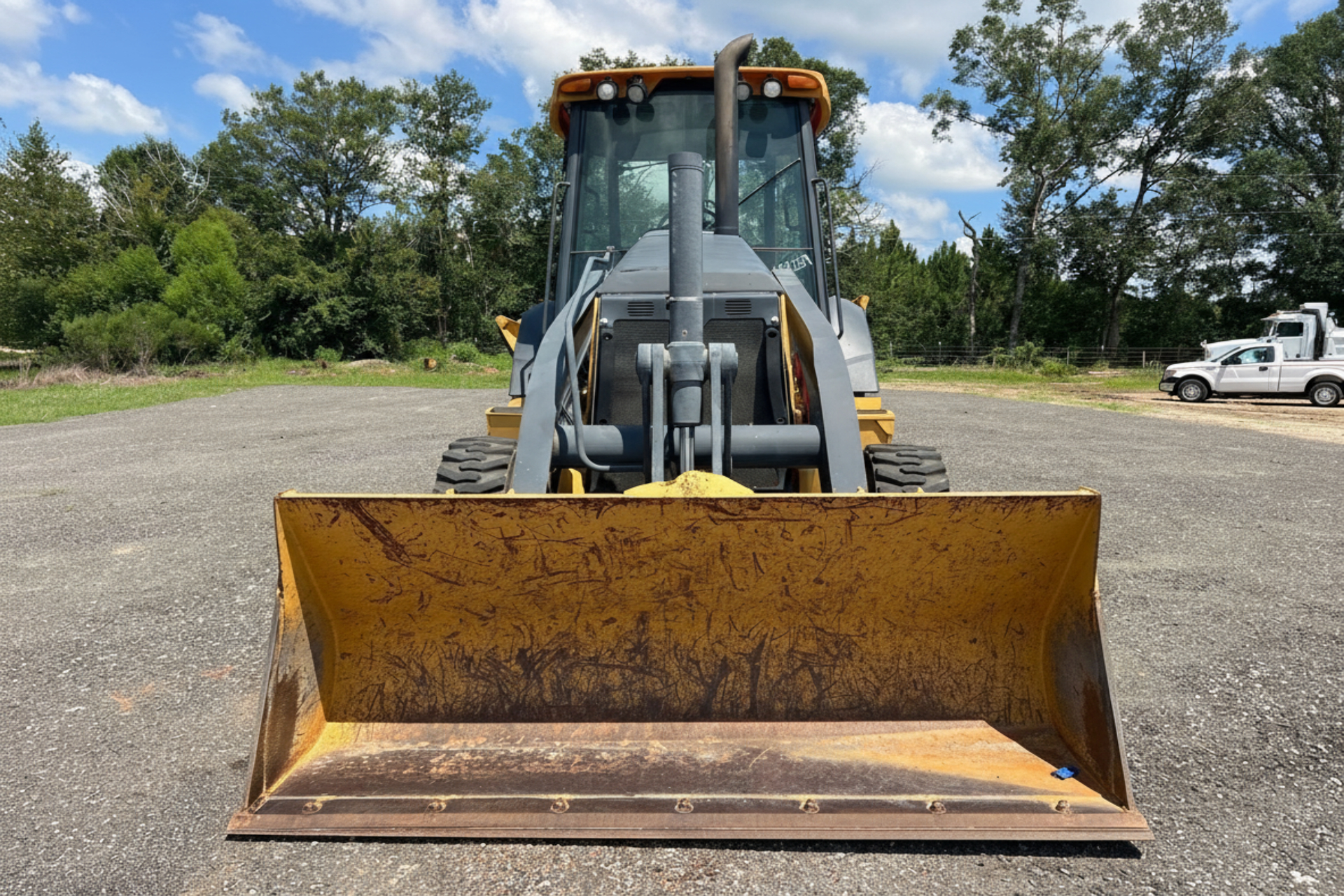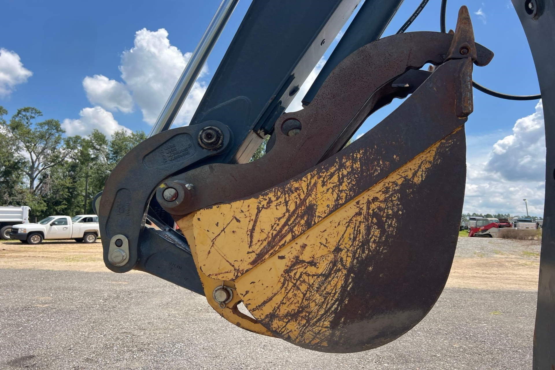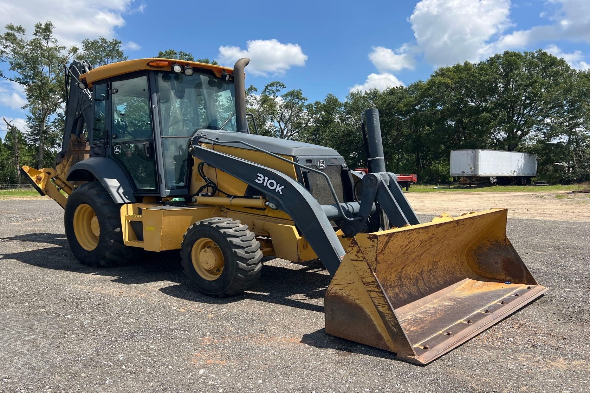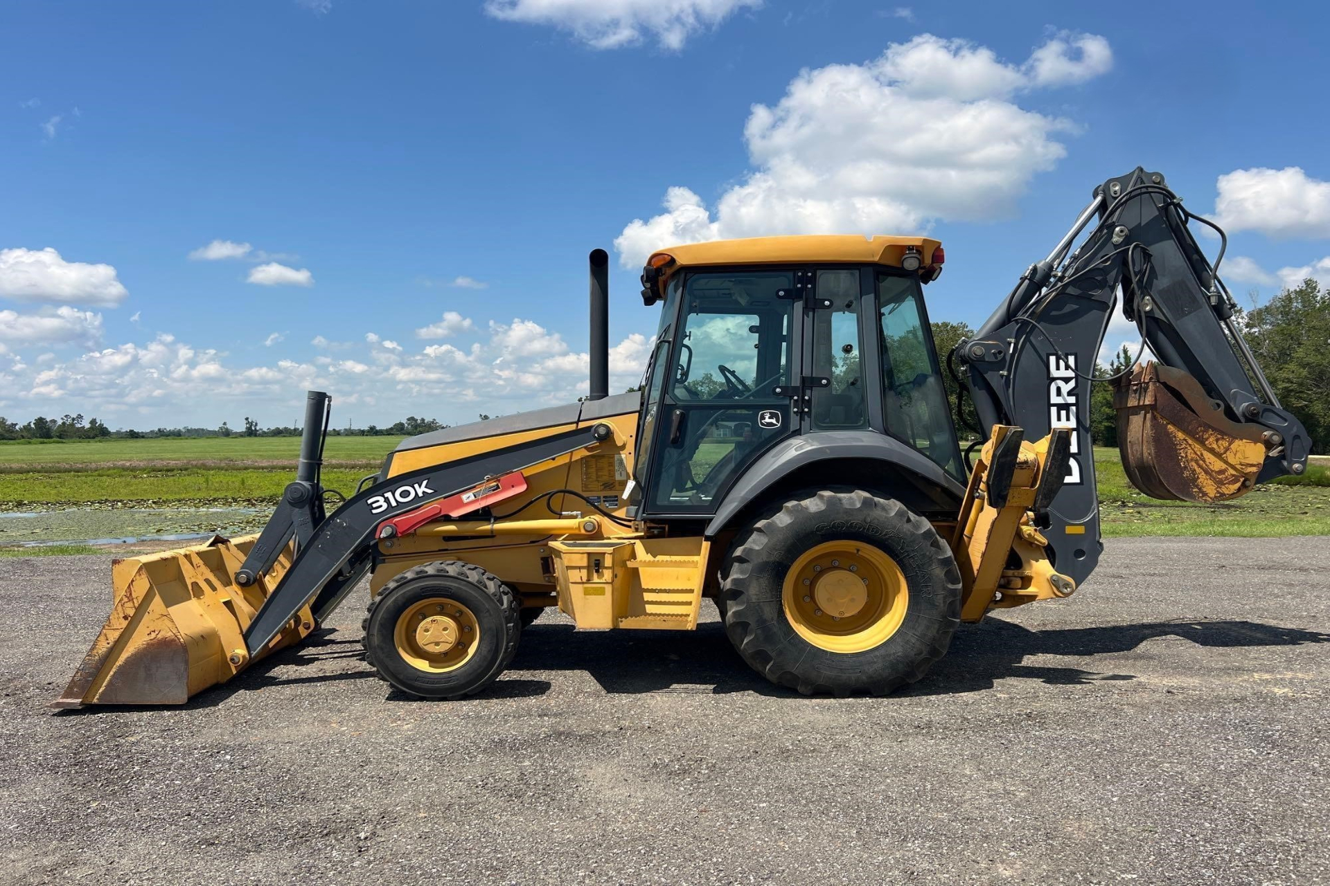 2015 John Deere 310K equipped with an enclosed cab, heat & A/C, 4-wheel drive, extendable dipper, and front quick coupler.