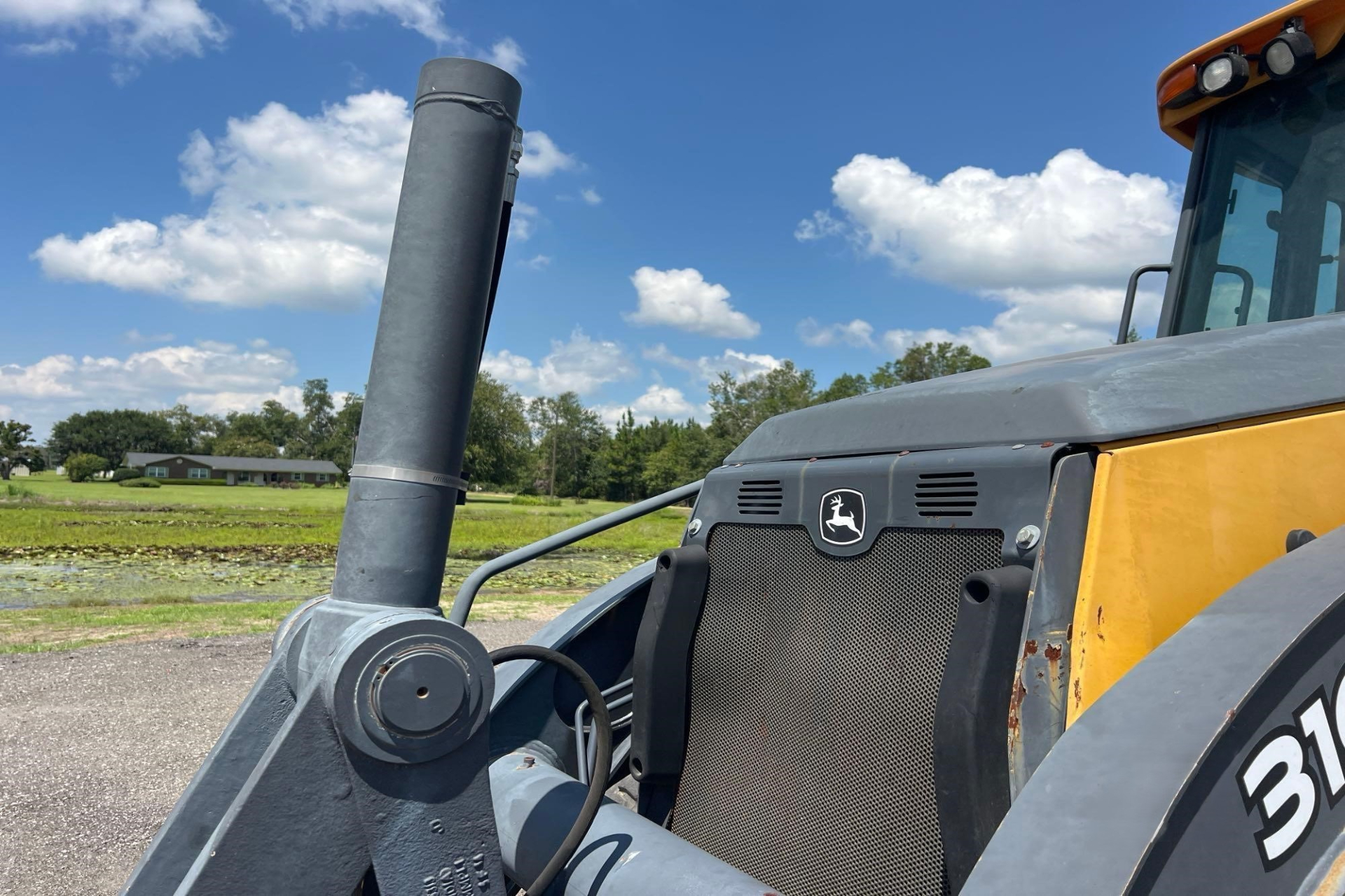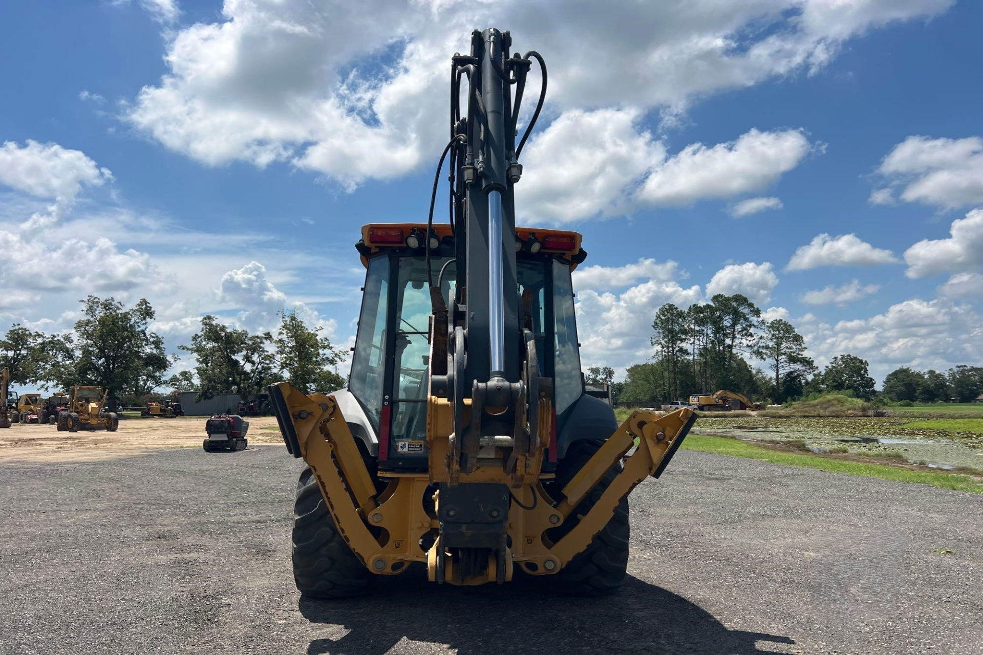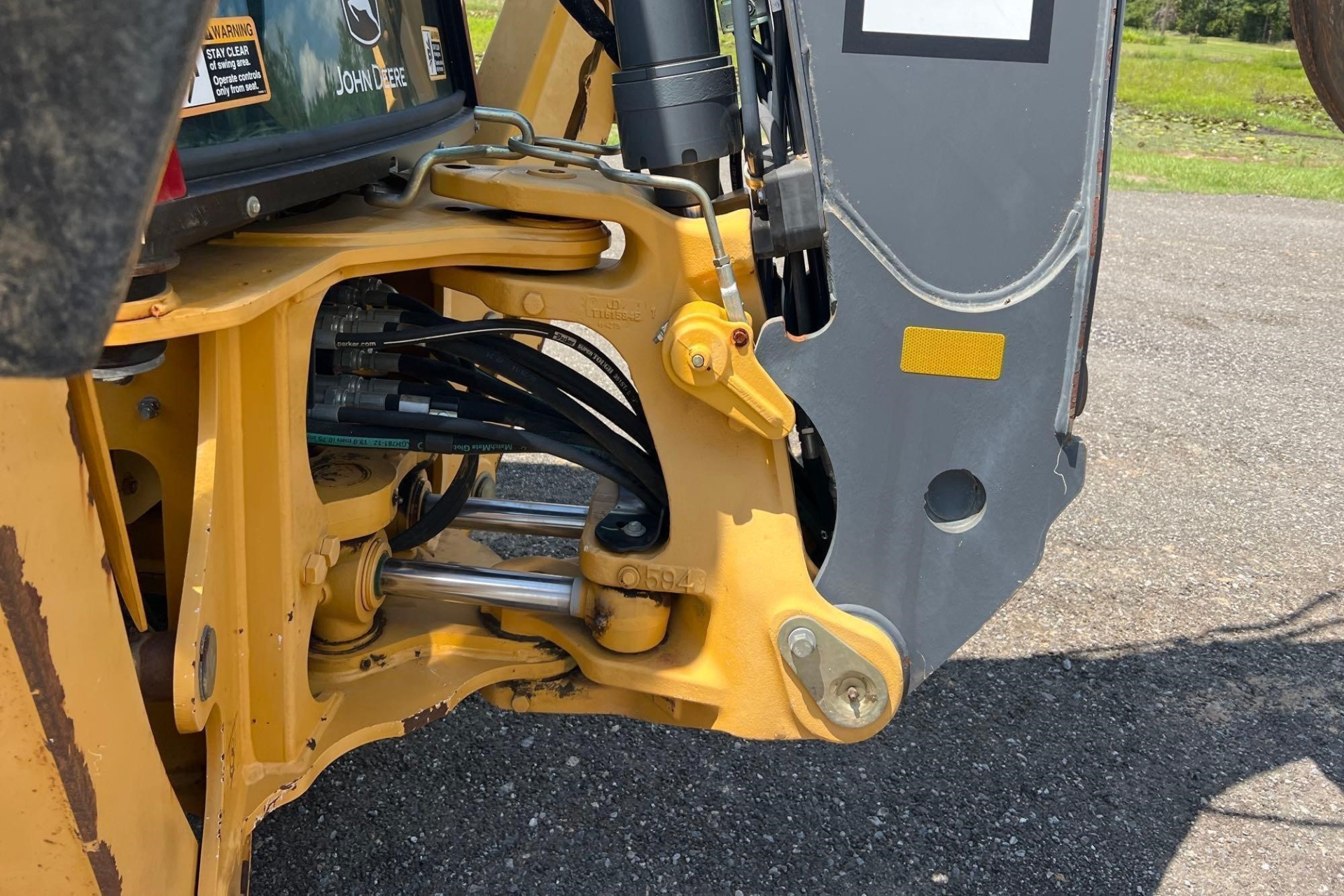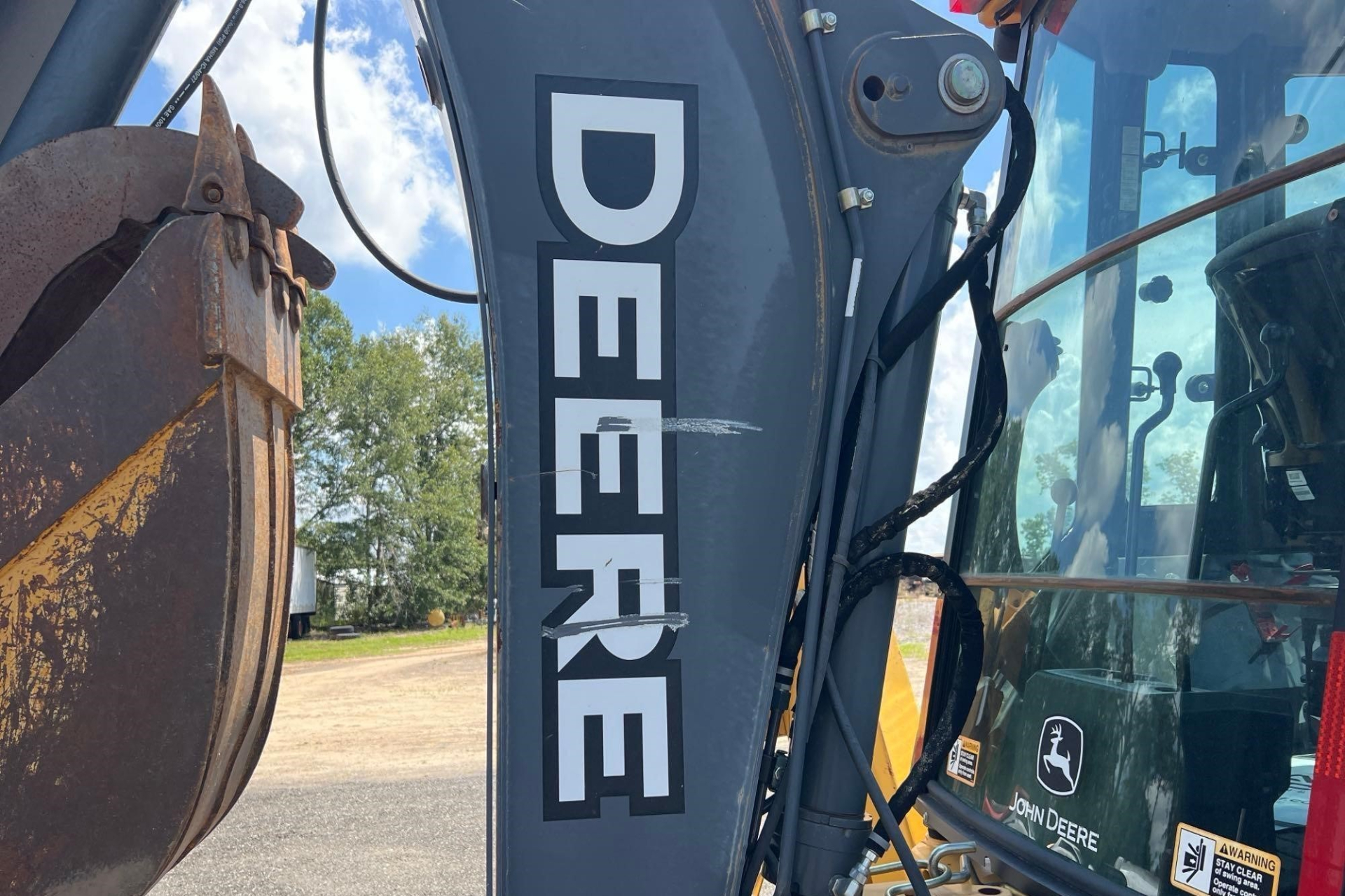 2015 John Deere 310K equipped with an enclosed cab, heat & A/C, 4-wheel drive, extendable dipper, and front quick coupler.